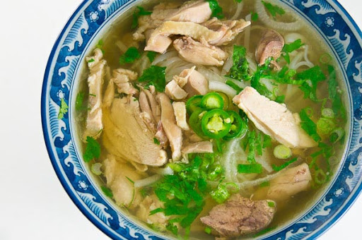 Normally I’m a big fan of adding condiments such as basil, bean sprouts hoisin and hot sauce to phở bò (beef pho), but I prefer my phở gà northern style: with wider noodles and a minimum of garnishes. Perhaps it’s because the more delicate chicken broth is easily smothered, or maybe it’s because the first really great bowl of phở gà I had was Hà Nội style. Whatever the case, the only table-side condiment I serve my phở gà with is pickled green chilies.