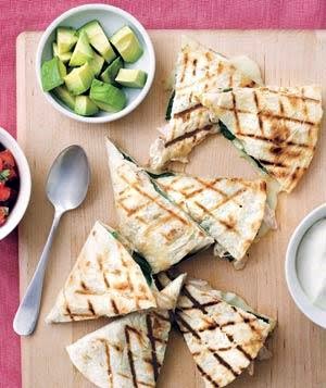 1.Heat grill to medium. In a large bowl, combine the chicken, spinach, and cheese. Dividing evenly, place the mixture on one half of each tortilla. Fold the other half over to cover.