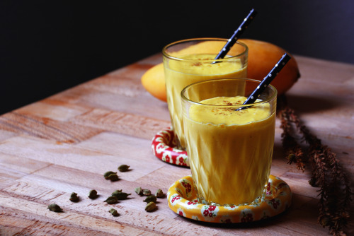 Combine mango, milk, yogurt, sugar and ground cardamon in a blender and blend until smooth. Taste it! Add more sugar or ground cardamon to your liking and blend again if needed. Divide lassi into two beautiful glasses, garnish with a pinch of cardamom and serve. To enjoy cold lassi, use frozen mango, cold milk and yogurt or simply pop it in the refrigerator and chill till cold.