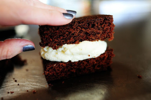 -Place frosting into a frosting bag. Squeeze frosting onto one rectangle of cake. Press second rectangle on top.