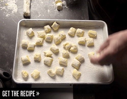 4. Using a pastry cutter, divide the dough into 6 equal portions. With floured hands, roll each piece into a log about a ½ inch in diameter. Cut the log into ½-to-1-inch-long pieces. Place the dunderi on the prepared baking sheet and repeat with the remaining dough. Make sure the dunderi pieces are not touching, so they don't stick together. Make ahead: The dunderi can be made, covered and chilled in the fridge for up to 2 days or frozen on the baking sheet and transferred to a resealable plastic bag. Use within 1 month.