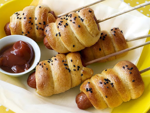 Brush the dough-wrapped dogs with the beaten egg; sprinkle with sesame seeds, if desired. Bake until golden, 15 minutes.