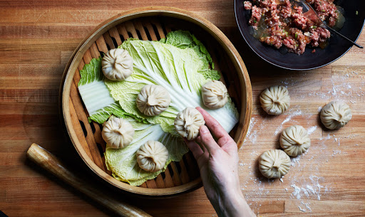 Place several large cabbage leaves in steamer, leaving about a 1" border around the sides for steam to travel through. Lightly coat cabbage with nonstick spray (a dumpling that sticks is a dumpling that tears) and set steamer next to work station.