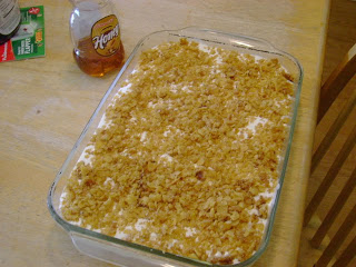 Pour ice cream mixture on top of crust in the 9x13 pan. Sprinkle the rest of the crumbs on top and freeze. Lightly drizzle each serving with honey. OLE!