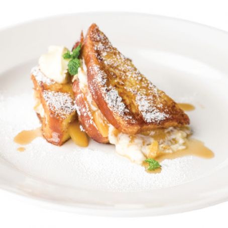 Your search is over for a delicious and perfect brunch! Takes a little effort but the results are amazing! Picture this, French toast prepared with a vanilla-bourbon brioche topped with brandied peaches and mascarpone filling, then drizzled with a bourbon syrup after adding a pad of smoked butter. Enough said, enjoy!