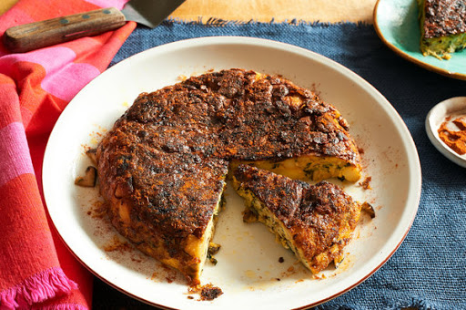 To flip, place the plate, lid or cutting board over the pan. Using towels or mitts, grasp the plate, lid or board and the skillet together and turn them over so the tortilla comes out. Return the skillet to the stove on medium heat, add the remaining half-tablespoon of oil, slide the tortilla back into the pan to cook the second side for 1 to 2 minutes. Transfer to a platter, dust with espelette or cayenne and serve at once or set aside to serve warm.