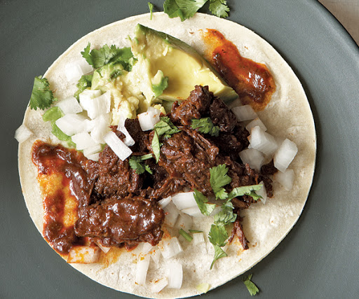 Make tacos with the warm tortillas and the chile con carne, topping them with chopped white onion, avocado (if using), and cilantro.
