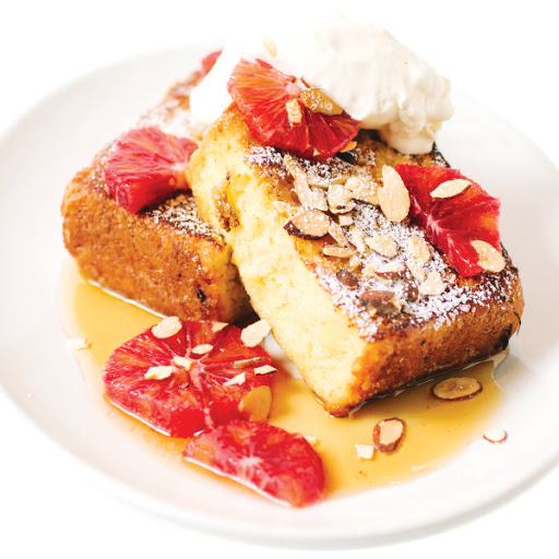 Place hot French toast on plate. Dust with powdered sugar. Spoon maple syrup around bottom of French toast. Finish with dollop of whipped crème fraîche and sprinkle of toasted almonds. Arrange blood orange slices on top and serve.