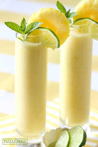 Garnish with a pineapple round, lime wedge, and sprig of mint!