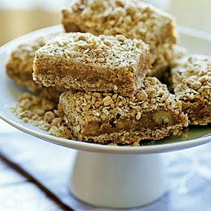 2. Combine sugar and butter in a large bowl. Stir in vanilla and egg. Weigh or lightly spoon flour into dry measuring cups; level with a knife. Combine flour, oats, 1/2 teaspoon salt, and baking soda in a bowl. Add oat mixture to sugar mixture; stir with a fork until combined (mixture will be crumbly). Place 3 cups oat mixture into the bottom of a 13 x 9–inch baking pan coated with cooking spray; press into bottom of pan. Set aside.