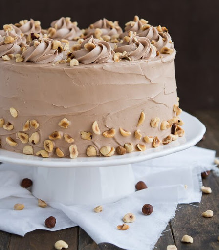 Place one cake on a cake stand and top with one fourth of the frosting. Place the second cake on top upside-down. Apply a thin layer of frosting on the top and sides of cake to create a crumb layer. Place cake in the fridge for 30-60 minutes and then frost the top and sides. Pipe additional decorations on top. Sprinkle the top of the cake with chopped hazelnuts and press more into the sides.