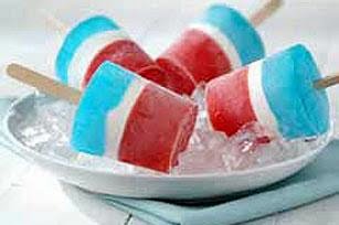 SPOON about 3 Tbsp. of the whipped topping over red gelatin in each cup; top evenly with blue gelatin, adding about 1/4 cup of the gelatin to each cup. Freeze 1 hour or until almost firm. Insert wooden pop stick or plastic spoon into center of each cup for handle. Freeze an additional 4 hours or overnight. To remove pops from cups, place bottoms of cups under warm running water for 15 sec. Press firmly on bottoms of cups to release pops. (Do not twist or pull pop sticks.) Store leftover pops in freezer.