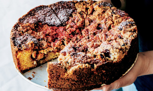 Equal parts fruit crumble and coffee cake, this not-too-sweet dessert starts out bright pink but bakes to a toasty golden brown.