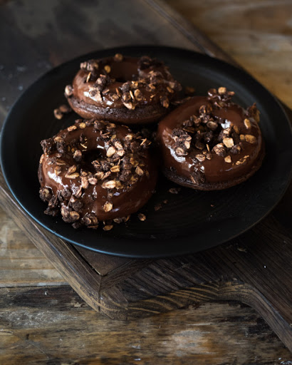To decorate: Drizzle each doughnut with Milk Stout Ganache, then top with the Chocolate Oat Crumble.