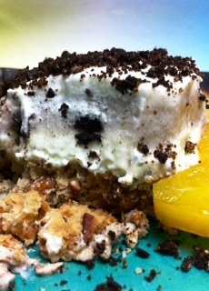 For the last layer, spread whipped cream evenly over the Oreo pudding mixture, then sprinkle crashed Oreo cookies crumbles over the top.