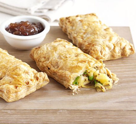 3.Heat oven to 200C/fan 180C/gas 6. Unroll the pastry rectangle, place on a floured surface with the long side towards you and roll it out a little more to make it into a square shape. Cut into 4 squares, then cut each one in half so you have 8 long rectangles. Place 4 of them onto a baking sheet, brush the edges with beaten egg and place a quarter of the filling down the centre of each. Top with the remaining pastry, then pinch the edges together to make a sealed parcel. Brush with more egg, then bake for 20 mins until puffed and golden. If cooking from frozen, bake for 30 mins. Serve with fresh green salad and a spoonful of chutney.