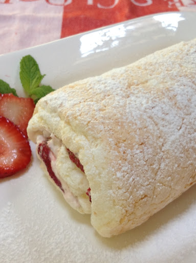 4. For the filling, in a medium bowl, combine 2 tablespoons of whipped topping with preserves, stir to blend. Fold in remaining topping. Unroll cooled cake, spread filling over cake, leaving ½ inch border, and top the filling with strawberries. Starting from the short side closest to you, reroll cake, cover with plastic wrap and refrigerate until ready to serve.5. When ready to serve, remove plastic wrap, slice cake in 1” slices, and sift slices with remaining powdered sugar.