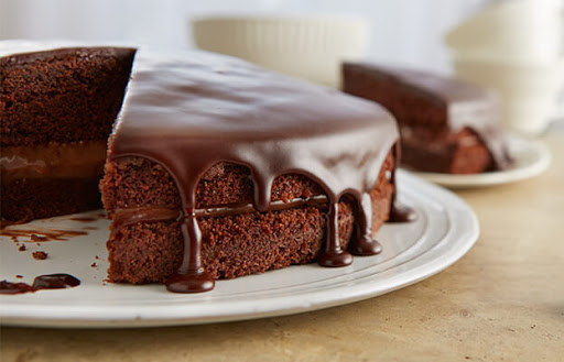 Prepare SATINY CHOCOLATE GLAZE. Pour onto top of cake, allowing some to drizzle down sides. Refrigerate until serving time. Cover; refrigerate leftover cake.