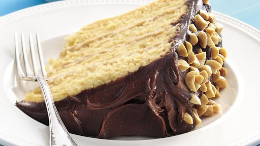 Split each cake layer horizontally to make 2 layers. Fill each layer with about 2/3 cup peanut butter mixture to within 1/2 inch of edge. Frost side and top of cake with frosting. Press peanuts onto frosting on side of cake. Store covered in refrigerator.