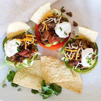 Meanwhile, bring a large nonstick skillet to medium heat, then add beef and onions. Cook, breaking up meat with a spoon and cook until no longer pink. Drain grease off of meat and stir in taco seasoning, along with the amount of water the package calls for. Cook for 4 to 5 minutes until thickened. Stuff cooled peppers with lettuce, meat, then top with cheese, sour cream and salsa. Serve with tortilla chips if desired.