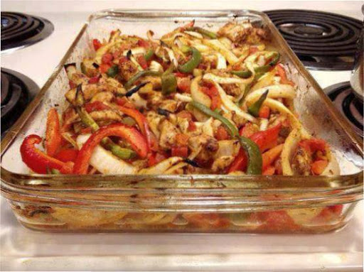 Next add the tomatoes, peppers, and onions to the dish and stir to combine.