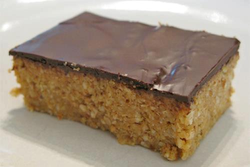6. Melt chocolate in a double boiler. Drizzle over almond coconut base and spread with a spoon or rubber spatula until evenly coated. Place bars back in refrigerator for approximately 5 minutes, until chocolate is solid but still a little soft (for ease of cutting). Cut into bars and store in a plastic container in the fridge.