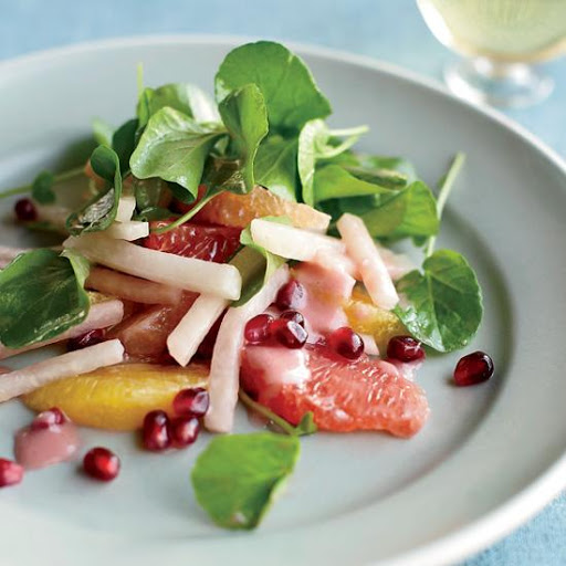 Using a sharp knife, peel the grapefruit and oranges, removing all of the bitter white pith. Working over a bowl, cut in between the membranes to release the sections. Add the jicama, watercress and pomegranate seeds to the bowl. Add the dressing, toss gently and serve right away.