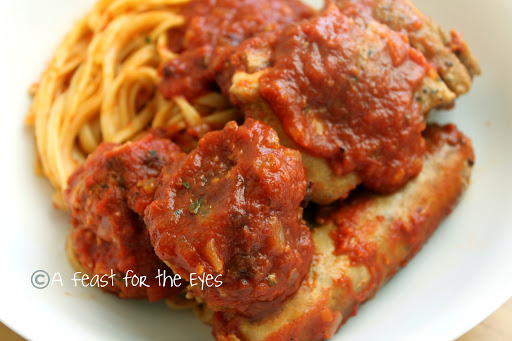Note: Prosciutto and cheese are added to the meatball mixture to mimic the flavor of the brasciole.