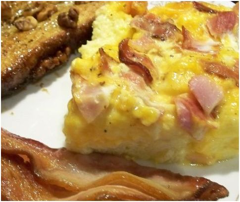 Place bread in buttered casserole dish in one layer. Cover with ham and cheese. Beat together remaining ingredients and pour slowly over ham and cheese. Bake in preheated 350 degree oven for 20 to 30 minutes until golden brown.