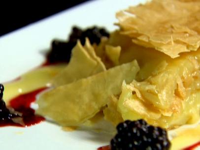 Using a very sharp knife carefully cut the Napoleon into 8 portions using the score marks as a guide. Drizzle some lemon sauce on each serving plate and place a portion of Napoleon in the center of each one. Spoon the crushed blackberries around and serve at once.
