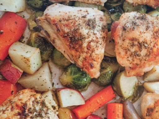 Preheat oven 475°. Toss Brussels sprouts, potatoes, shallots, carrots, garlic, 2 tsp thyme, oil, salt and 1/4 tsp pepper together in bowl. Combine butter, remaining 2 tsp thyme, remaining 1 tsp rosemary, 1/4 tsp salt and 1/8 tsp pepper in second bowl; set aside. Pat chicken dry with paper towels and season with salt and pepper. Place vegetables in single layer on rimmed baking sheet, arranging Brussels sprouts in center. Place chicken, skin side up on top of vegetables, arranging breast piece in center and leg and thigh pieces around perimeter of sheet. Brush chicken with herb butter and roast until breast, 35-40 minutes, rating pan halfway through cooking. Transfer chicken to serving platter, tent loosely with foil and let rest for 5-10 minutes. Toss vegetables in pan juices and transfer to platter with chicken.