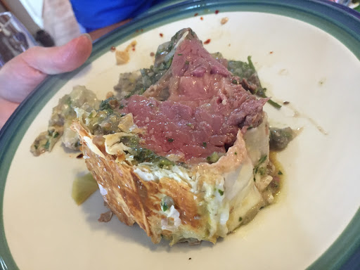 Preheat oven to 425 degrees F (220 degrees C). Place beef in a small baking dish, and spread with 2 tablespoons softened butter.