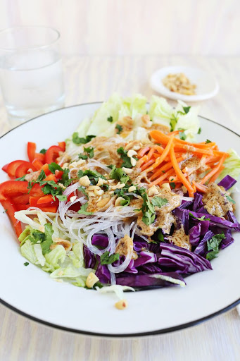 For the dressing whisk together the first five ingredients listed above. I made my dressing with peanut oil, but you could also use water. The oil adds a richness, but it has a tendency to separate. You can simply whisk it again before pouring it over your salad. Either way, whisk the oil or water in last, slowly drizzling it in as you whisk to help it blend in with the other ingredients.