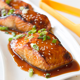 2. In a small bowl, whisk together barbecue sauce, honey, and Sriracha. Spread the sauce with a basting brush on top of each salmon fillet. Broil for 5 minutes, then baste each salmon fillet again. Return to oven and broil 3-5 minutes more. As soon as the salmon easily flakes with a fork, remove it from the oven.