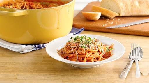 Add spaghetti, tomatoes, broth, cream and pepper flakes; heat to boiling. Boil 15 to 20 minutes, turning pasta frequently with tongs or fork, until pasta is cooked and sauce is thick and creamy. Serve with remaining ingredients.