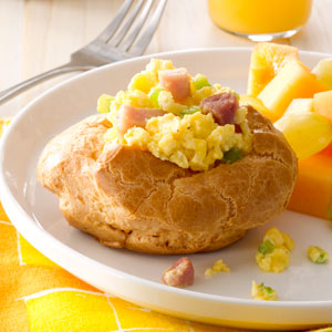 In a large skillet, saute green pepper and onion in butter until tender. In a medium bowl, beat eggs, salt and pepper. Add to skillet, stirring over medium heat until almost done. Add ham and cheese; stir until eggs are set. Spoon into puffs. Serve immediately.