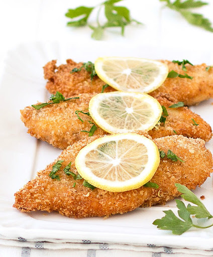 Garnished the crispy baked chicken breasts with a slice of lemon and chopped parsley, if desired.