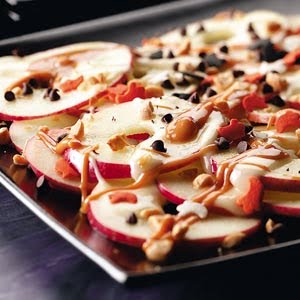 Meanwhile, in a large saucepan, melt marshmallows and butter. Arrange apple slices on a large platter. Drizzle with caramel; top with marshmallow mixture. Sprinkle with peanuts, chocolate chips and sprinkles. Serve immediately.