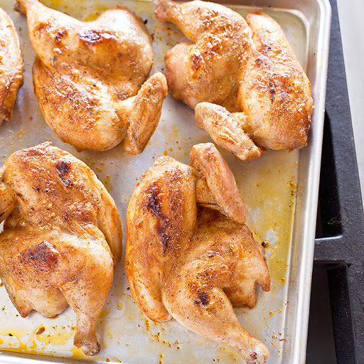 6. Remove hens from oven and heat broiler. Flip hens skin side up. Transfer sheet to upper rack and broil until well browned and breasts register 160 degrees and drumsticks/thighs register 175 degrees, about 5 minutes, rotating sheet as needed to promote even browning. Transfer to platter or individual plates and serve.