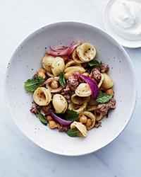 F&W’s Justin Chapple gives his pasta with sausage a twist by adding chickpeas and mint and finishing the dish with a dollop of yogurt.