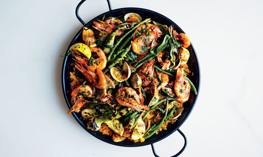 Arrange spring onions, haricots verts, and prawns over paella. Drizzle dish with reserved chile-parsley oil and squeeze some juice from grilled lemons over. Place remaining wedges on top of paella and serve.