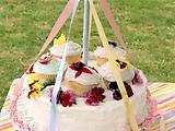 To assemble centerpiece, place cake on table. Insert the bottom end (without the excess ribbon) of the dowel into center of cake. Pipe colored icing around bottom of dowel. Carefully lay each color of ribbon on the table and arrange cupcakes at the ends of the ribbons. Tie the ends of the ribbons in bows and trim off the excess.