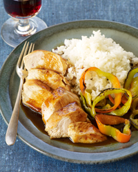 Wipe out the skillet. Add the remaining 1 tablespoon of oil and heat until shimmering. Add the pepper strips and cook over high heat, stirring occasionally, until crisp-tender and lightly charred, about 3 minutes. Transfer the peppers to plates. Slice the chicken breasts crosswise and transfer to the plates. Drizzle the sauce over the chicken and serve with rice.