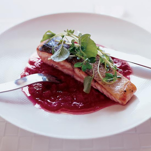 Rhubarb marmalade complements the simply cooked salmon. Serve with a green salad for a complete meal.