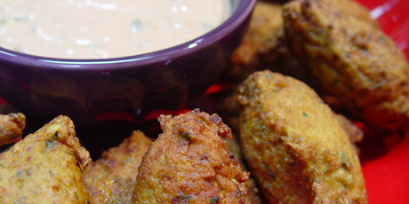 Using a pair of tablespoons form the chicken mixture into rough ball shapes. Carefully drop them into the fryer oil using one of the spoons to push the mixture off the other spoon. Fry until they are golden brown on all sides, about 5 minutes depending on the size.