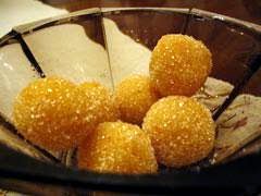 Rinse the tangerines, peel them and boil the tangerine peel for 5 minutes in order to soften it. Then place gradually the peels in a blender and grate them until they become a pulp. Mix sugar, with almond kernel and tangerine pulp well and mould mixture in small balls. Roll the almond balls in sugar in order to coat each ball with the sugar. Serve!