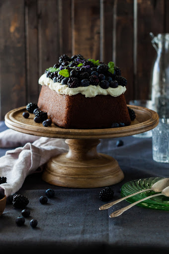 Spread the lemon mascarpone cream on top of the cooled cake. Top cream with the remaining blueberries and blackberries. Place sprigs of lavender on top, if desired.