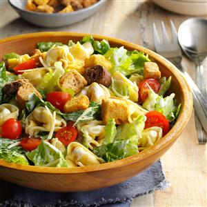 Drain tortellini and rinse in cold water; transfer to a large bowl. Add romaine and remaining Parmesan. Just before serving, drizzle with dressing; toss to coat. Top with croutons and tomatoes if desired.