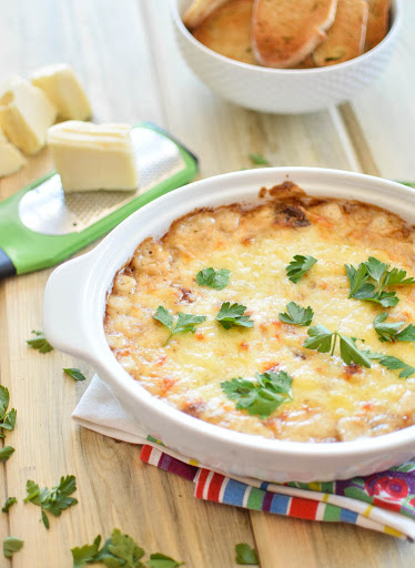 Pour the mixture into an 8x8 inch baking dish, and smooth to even out. Sprinkle the remaining cheese on top and bake, uncovered, for about 20-25 minutes, or until the top is bubbly and just beginning to brown.