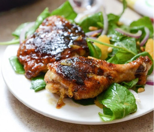 Place the chicken in the oven uncovered and bake for 20 minutes. Every 5 minutes, baste the chicken with the glaze in the bottom of the pan. Serve with greens.